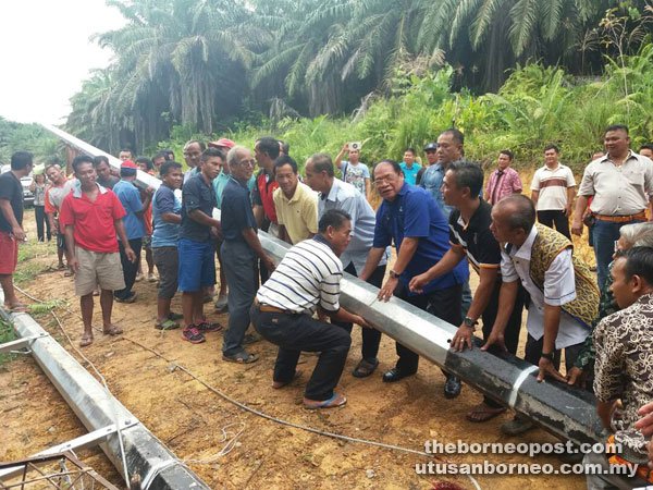 Meanwhile Nyalau led hundreds of villagers in a special ceremony to erect the first electric pole for the Ulu Lemanak rural electricity supply project recently.