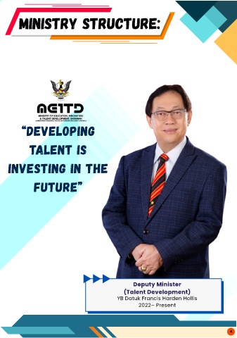 MINISTRY STRUCTURE: “Developing talent is investing in the future” Deputy Minister (Talent Development) YB Datuk Francis Harden Hollis 2022– Present 4