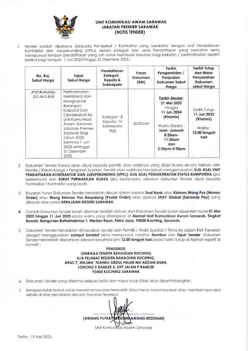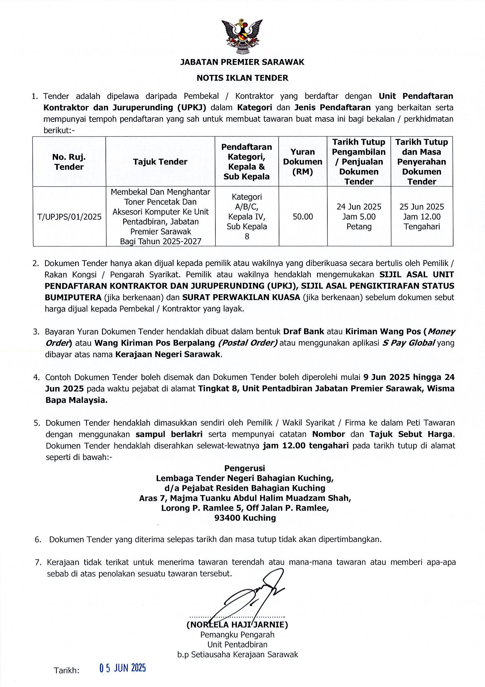 JABATAN PREMIER SARAWAK NOTIS IKLAN TENDER Membekal Dan Menghantar Toner Pencetak Dan Aksesori Komputer Ke Unit Pentadbiran, Jabatan Premier Sarawak Bagi Tahun 2025-2027