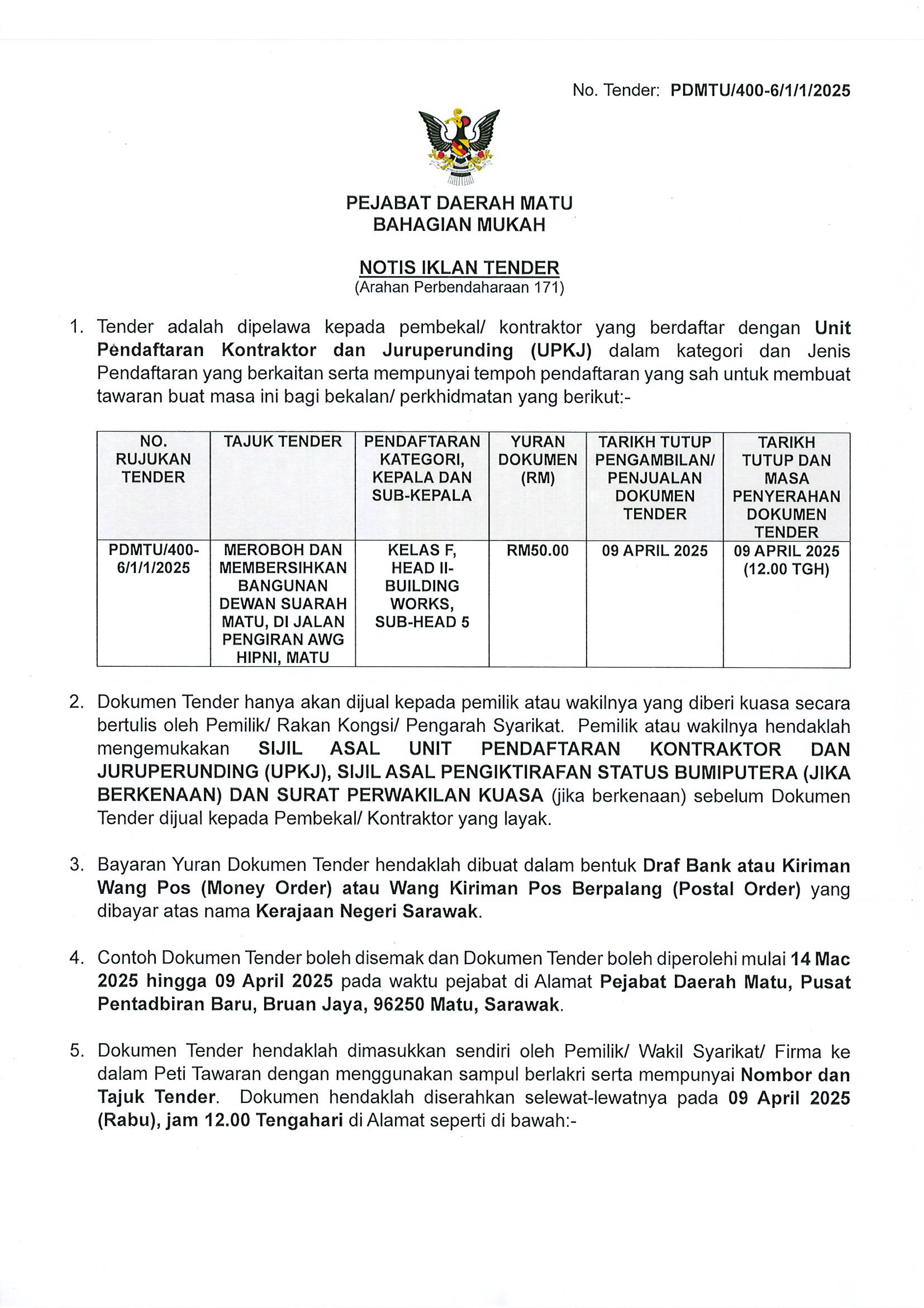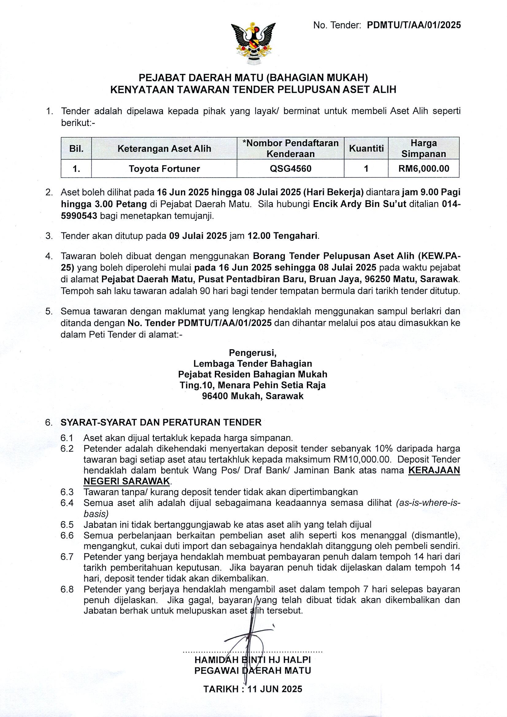Kenyataan Tawaran Tender Pelulupsan Aset Alih - Pejabat Daerah Matu