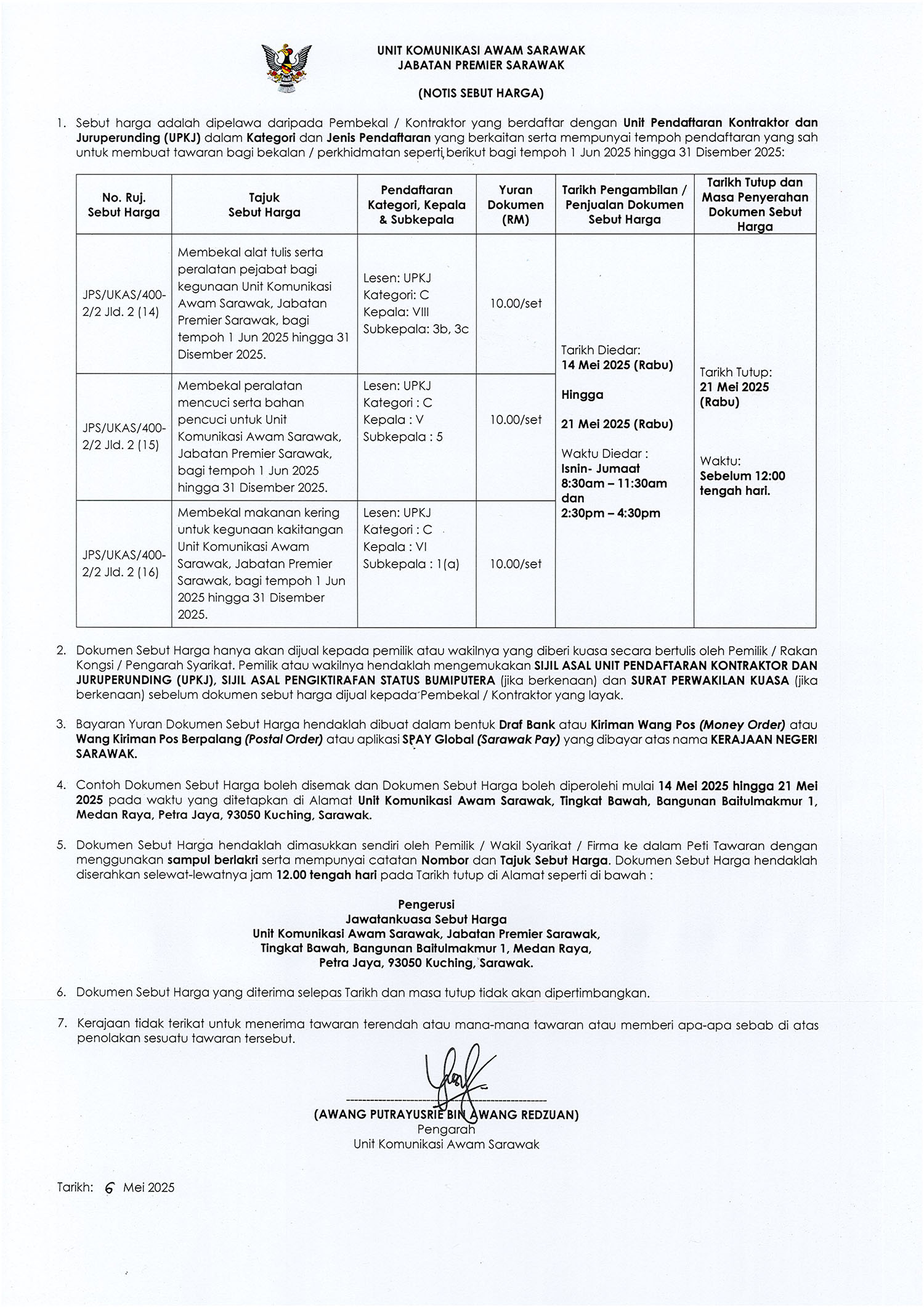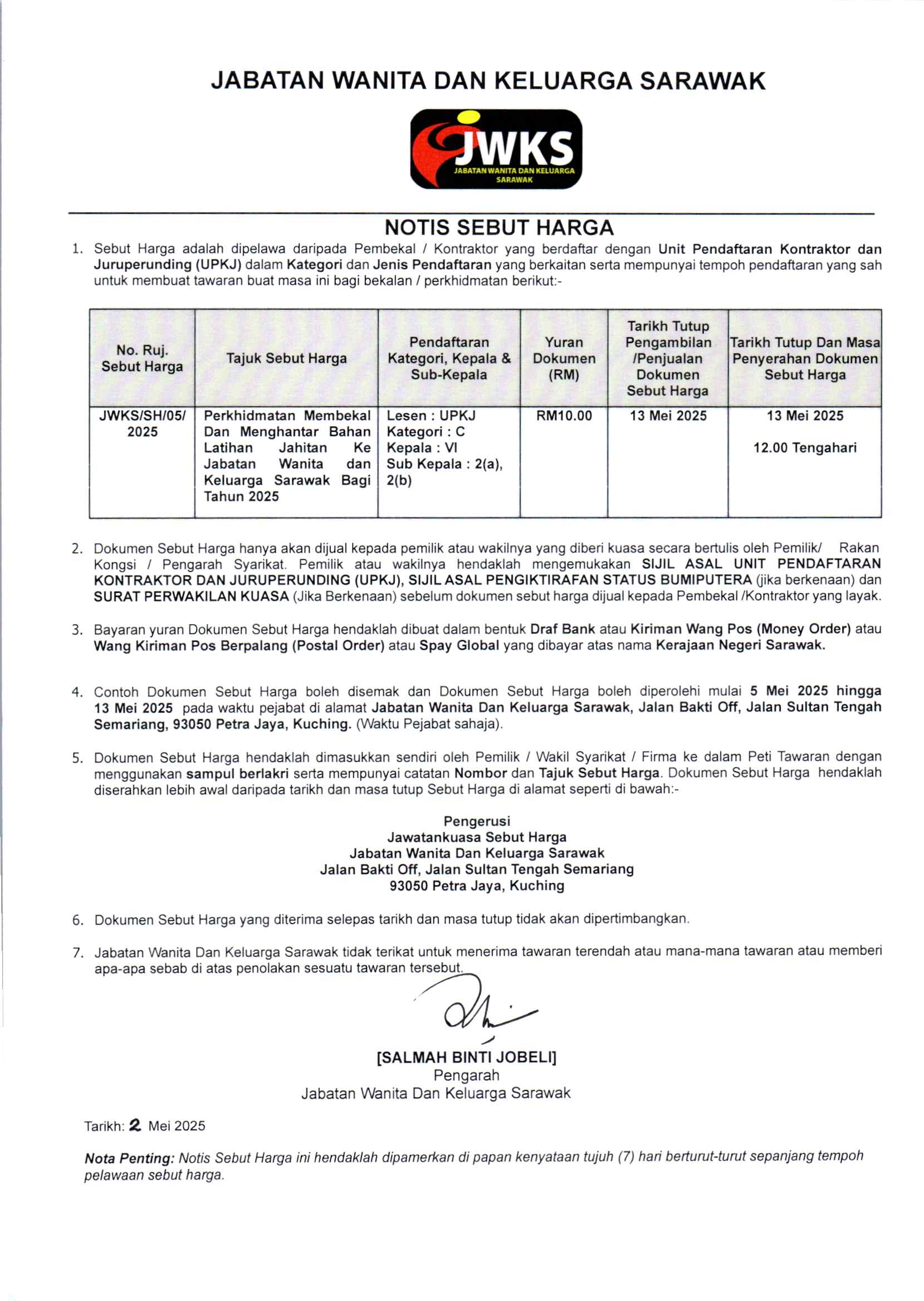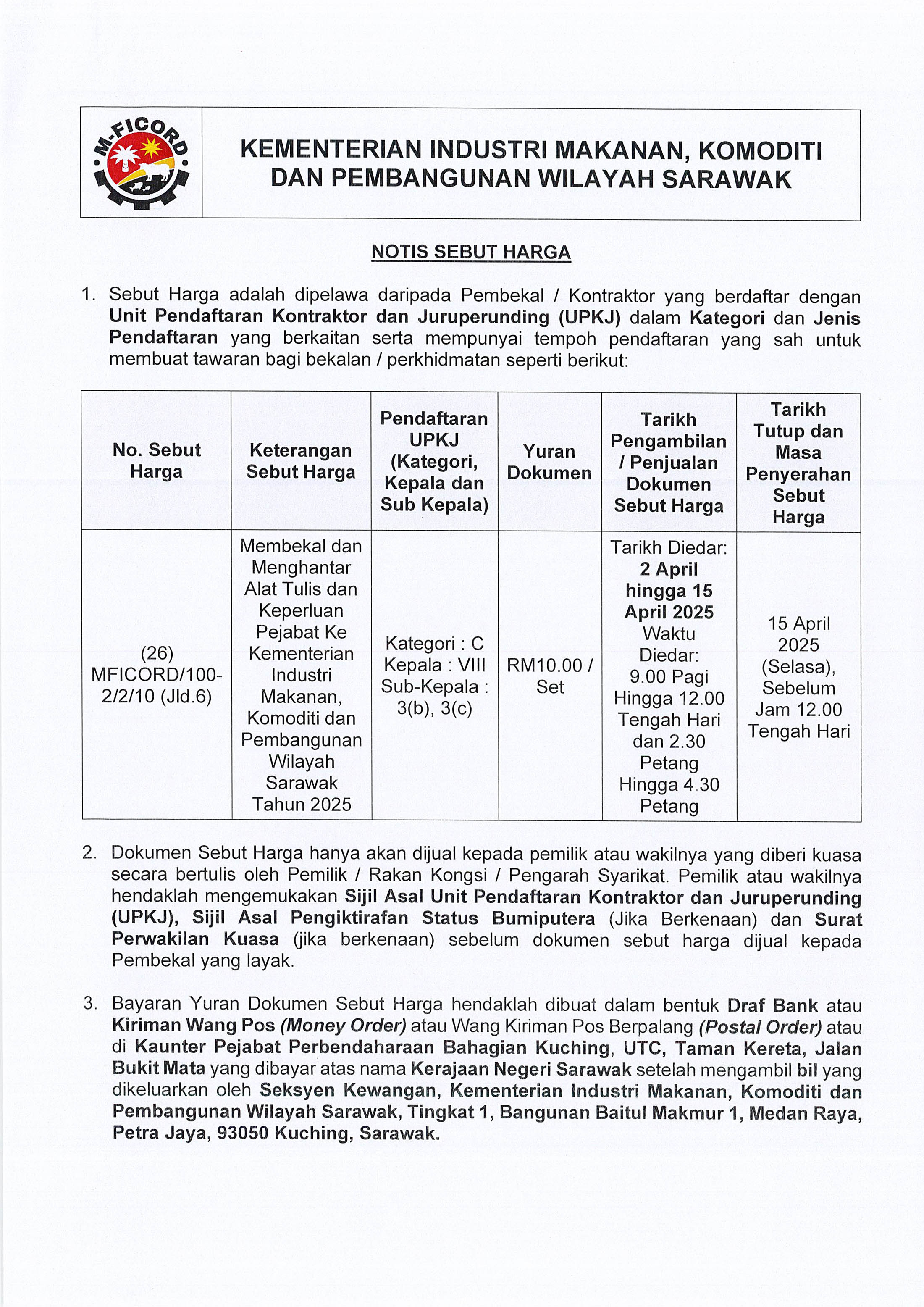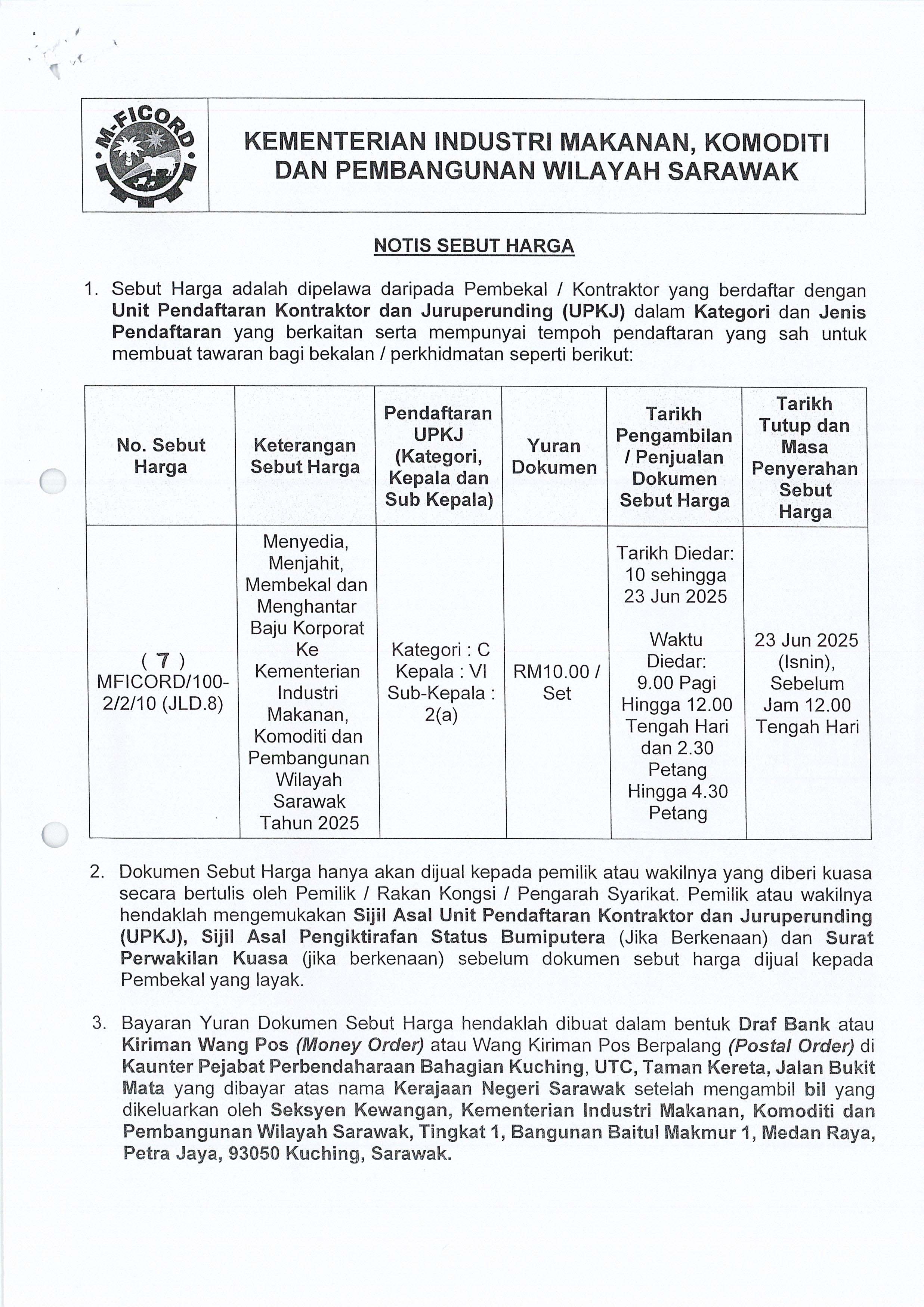 Notis Sebut Harga - Menyedia, Menjahit, Membekal dan Menghantar Baju Korporat ke Kementerian Industri Makanan, Komoditi dan Pembangunan Wilayah Sarawak Tahun 2025