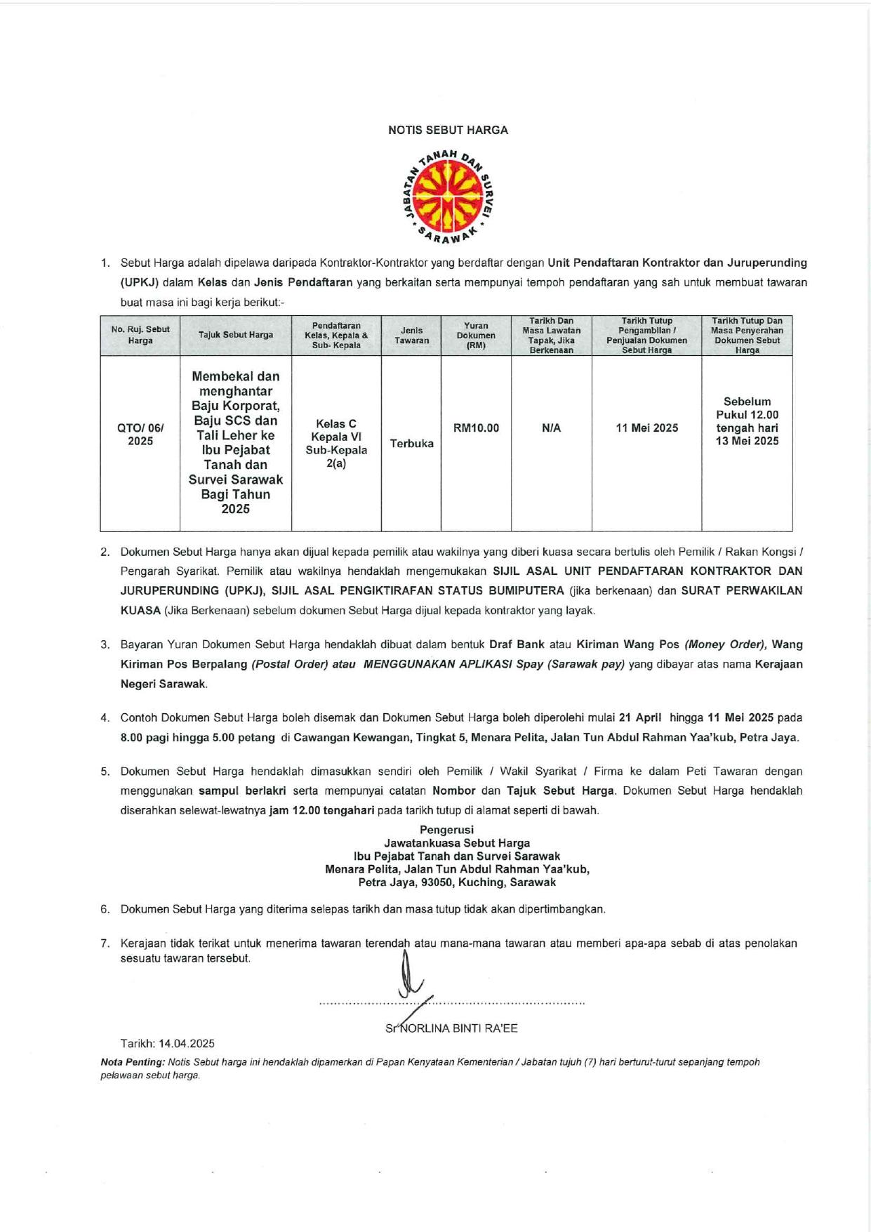 Notis Sebut Harga Baju Korporat Jabatan, Baju SCS dan Tali Leher Jabatan Tanah dan Survei Sarawak
