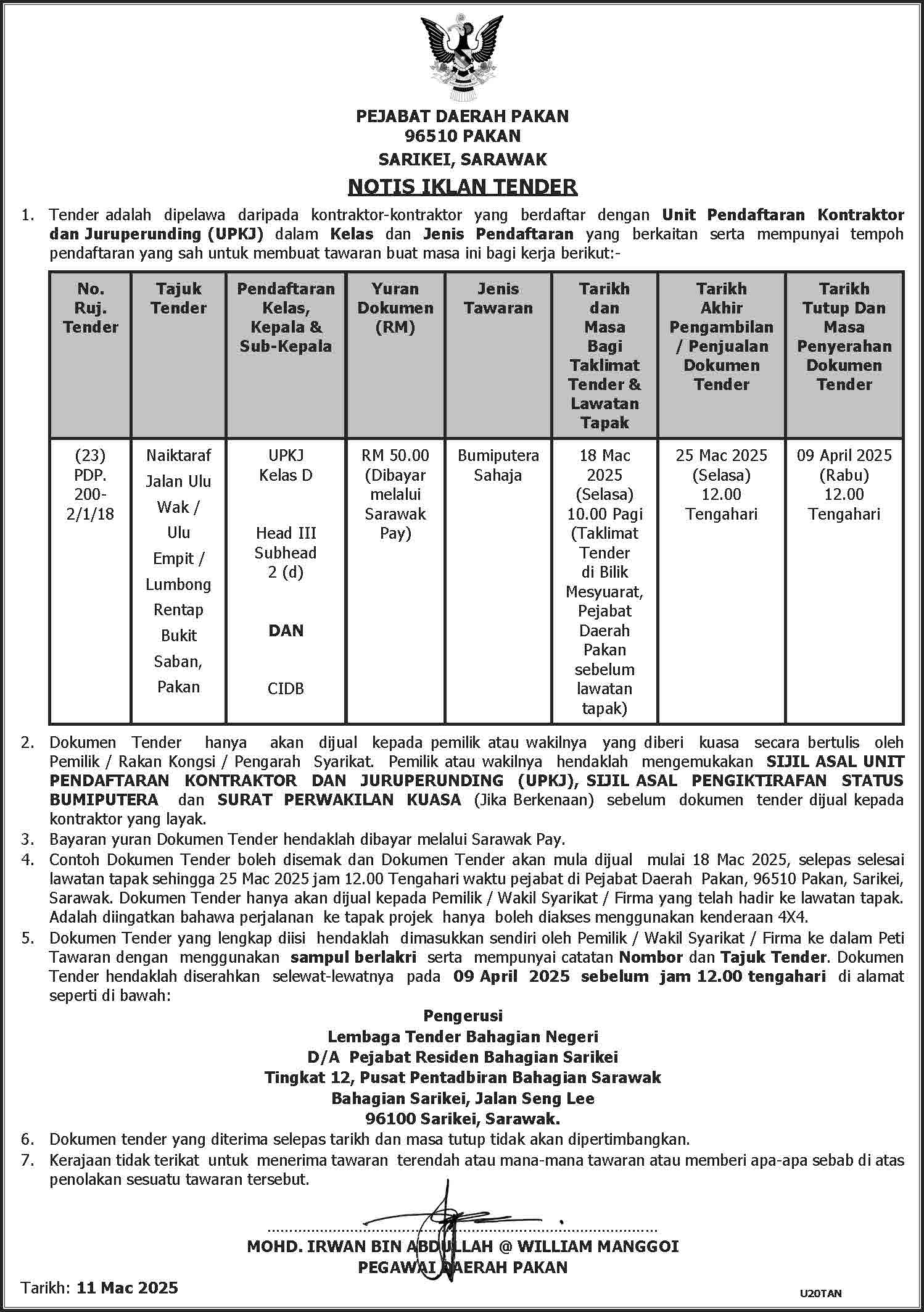 NOTIS TENDER NAIKTARAF JALAN ULU WAK-ULU EMPIT-LUMBONG RENTAP BUKIT SIBAU, PAKAN