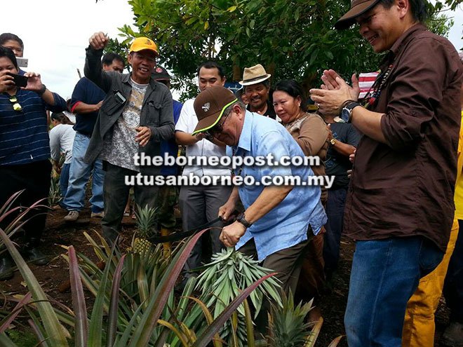 Dennis (right) applauds as Uggah (second right) cuts a ripe pineapple fruit as the Orang Ulu farmers look on.