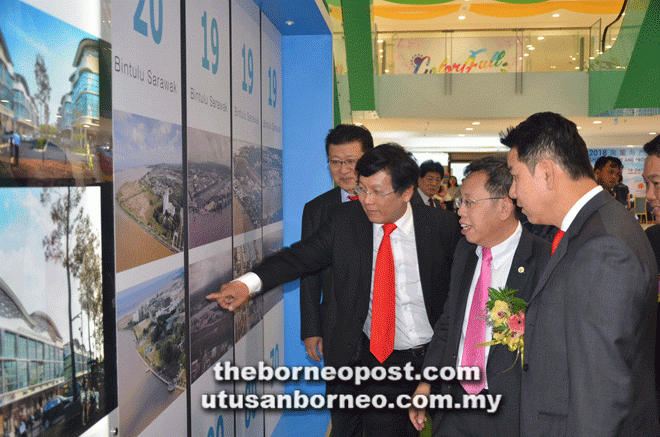 A representative of a developer explains some features of their project to Dr Sim (second right) as Ngui (left) and Sheda advisor Troy Yaw (right) look on.