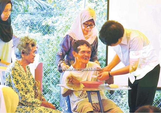 A trainee at PDK Dalat, Stephen Lihai, 48, smiles as Tokuda (right) helps him with the spoon while his mother Seriah Gameng, 74, (left) and Fatimah (second right) look on.