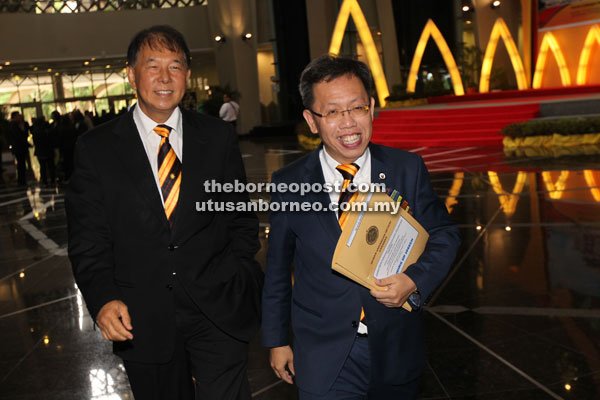 Dr Sim (right) seen leaving the State Legislative Assembly (DUN) complex yesterday with Datuk Sebastian Ting (BN-Piasau).